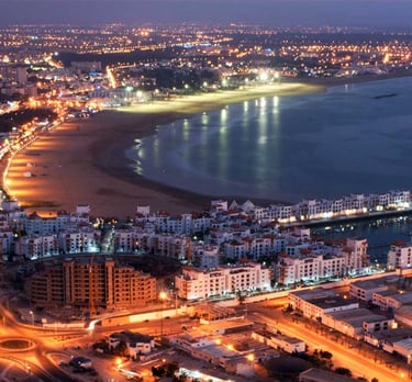 Agadir is Morocco's most modern and cosmopolitan Atlantic city, rebuilt after the 1960 earthquake into a wide, sun-drenched promenade lined with palms and beach cafes. With over 300 sunny days a year and a long crescent beach stretching 9 kilometres, Agadir is the gateway to Morocco's surf coast for Best waves.